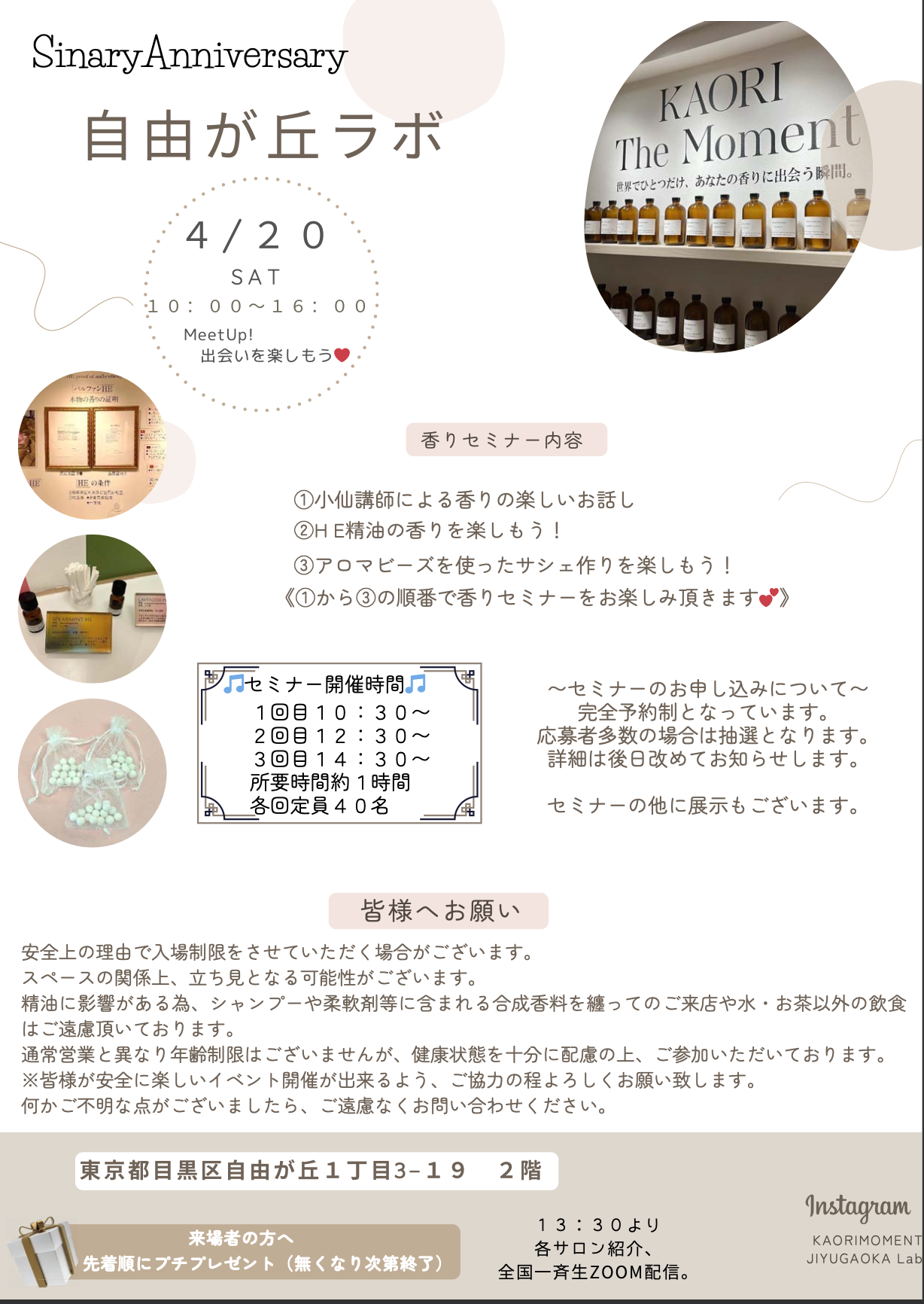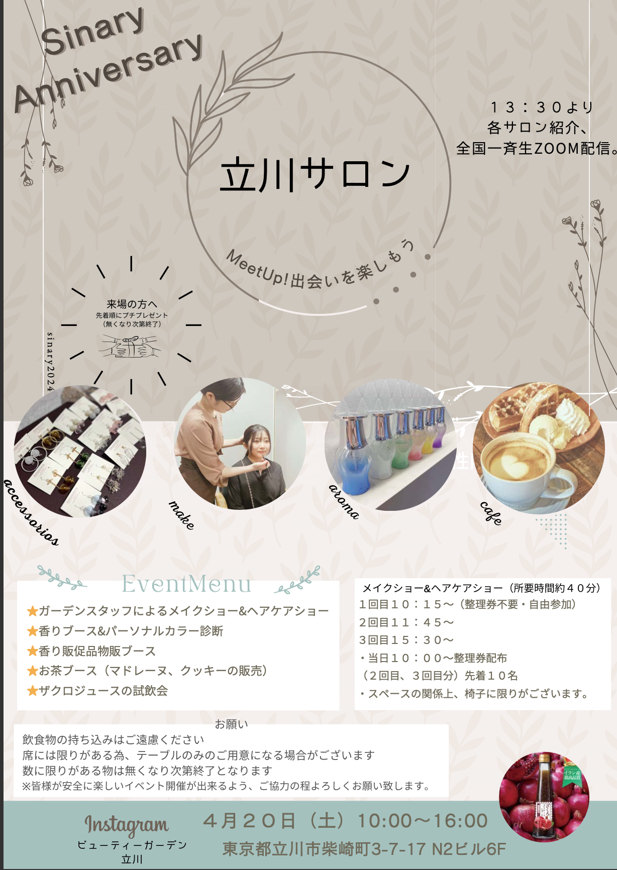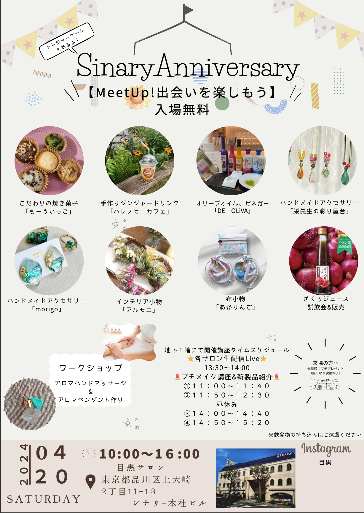 2024/04/20 シナリー記念日 本日4月20日は、シナリーの誕生日です。 2001年に生まれたシナリーは、皆様のおかげで今年で23年目を迎えることができました! 全国のサロンにてAnniversaryイベントを開催中。 目黒・立川・京都・沖縄・自由が丘 お近くの方はぜひサロンに遊びに来てください。 各サロンオリジナルのマルシェやイベントで盛り上がってます。 来場者全員にショコラサンドのプチギフトをプレゼントしています。 これからのシナリーにもご期待ください! 前の記事 一覧へ戻る 次の記事