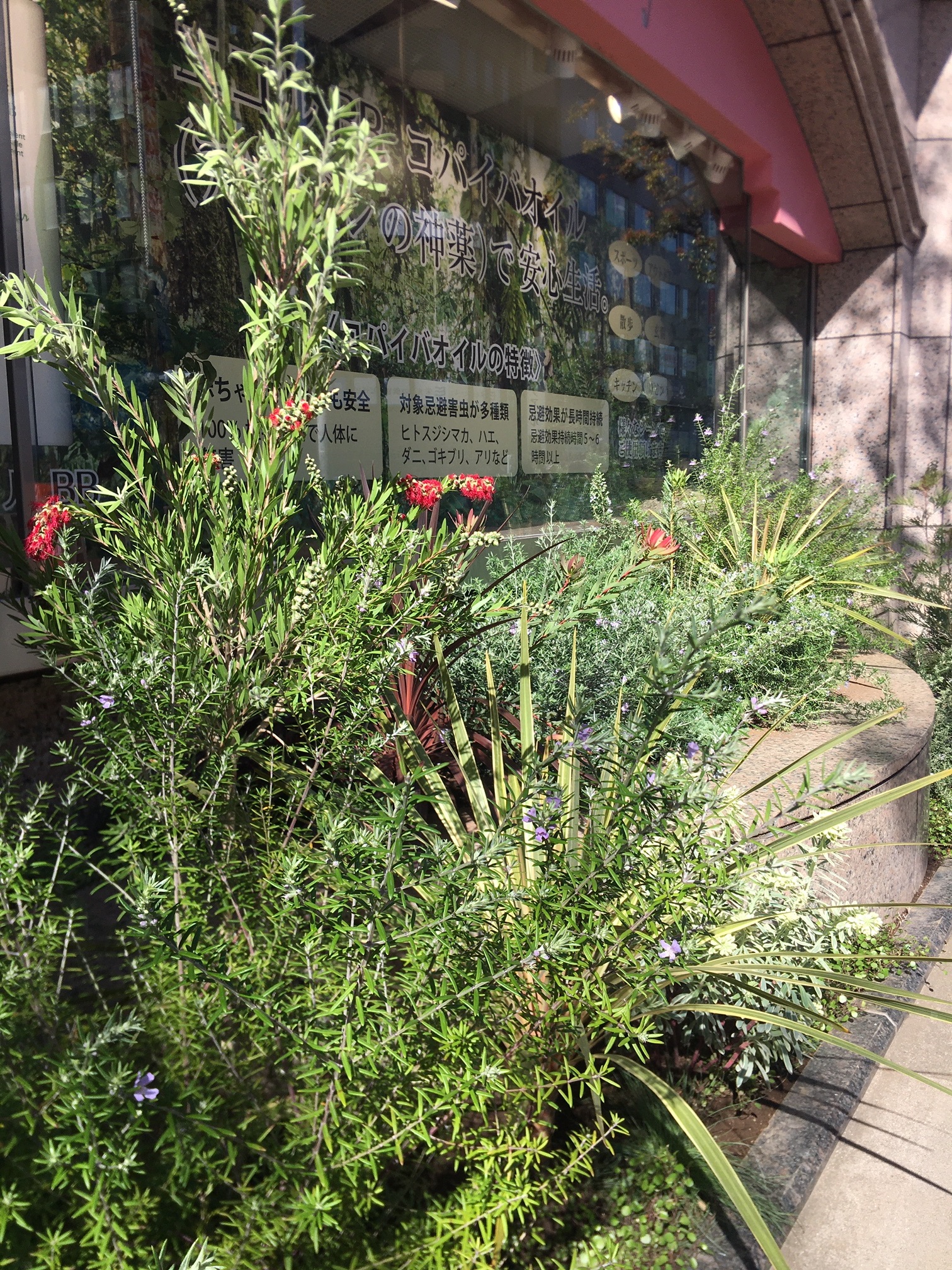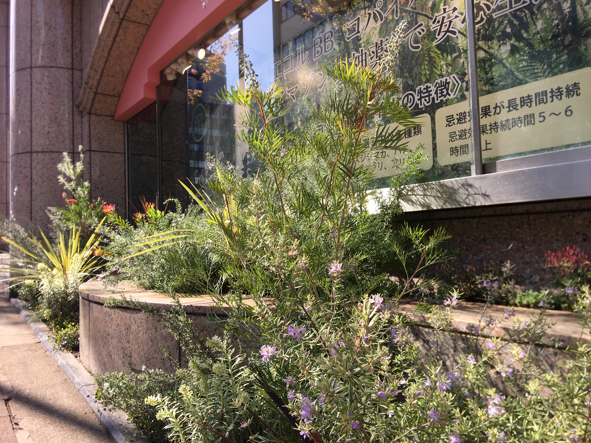 オーストラリアンローズマリーがキレイに花をつけて、横断歩道を渡ってくる人を出迎えています。